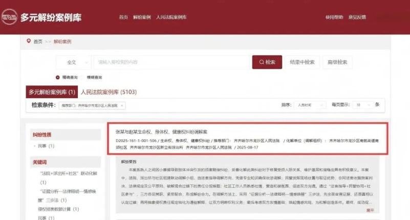 近日,龙沙区人民法院审理的《张某与赵某生命权、身体权、健康权纠纷调解案——“法院+派出所+社区”联动化解人身损害赔偿纠纷》入选最高人民法院多元解纷案例库。