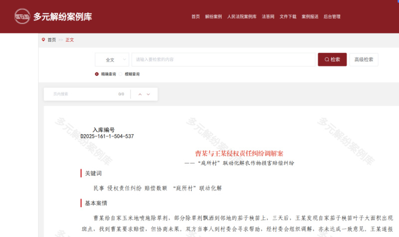 泰来县人民法院报送的《曹某与王某侵权责任纠纷调解案——“庭所村”联动化解农作物损害赔偿纠纷》入选最高人民法院多元解纷案例库。