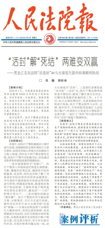 近年来,克东法院坚持省法院“一要二统三抓实”工作思路,深化“四化四解四到位”。9月3日,《人民法院报》在第七版刊发文章《“活封”解“死结” 两难变双赢——黑龙江克东法院“活查封”40 头生猪促欠款纠纷案顺利执结》,报道克东法院以脚步丈量现场,用协商替代“一刀切”,推动执行工作从单向兑现向多元共赢升级的先进做法。
