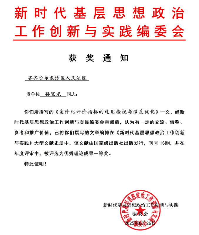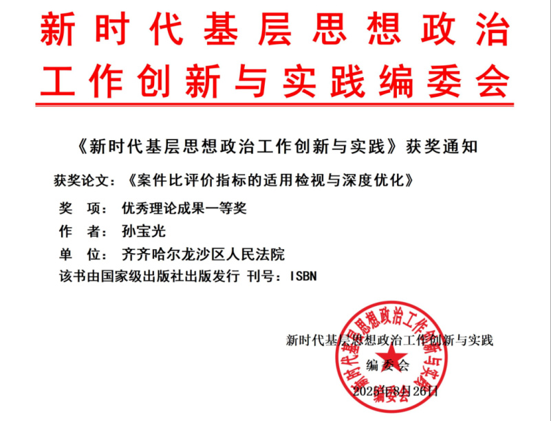 8月26日,龙沙区法院立案庭副庭长孙宝光同志撰写的《案件比评价指标的适用检视与深度优化》,被收录于国家级出版社出版发行的大型文献史册《新时代基层思想政治工作创新与实践》中;并在年度评审中,获评优秀理论成果一等奖。
