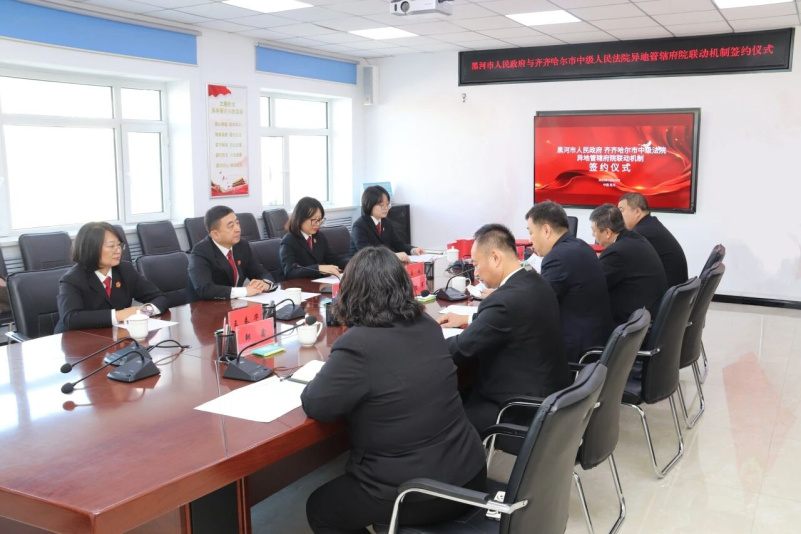 搭建政府法治与人民司法对接平台,既是提升区域治理现代化水平的关键抓手,更是优化地区发展环境、回应群众急难愁盼的务实之举。10月24日,齐齐哈尔市中级人民法院与黑河市人民政府在黑河市司法局联合举行行政案件府院联动机制签约仪式。黑河市政府党组成员、秘书长邸建军,齐齐哈尔中院党组成员、副院长范永涛代表双方,共同签署《关于建立异地管辖行政案件府院联动机制的意见》,为跨区域行政争议协同化解筑牢制度基础。