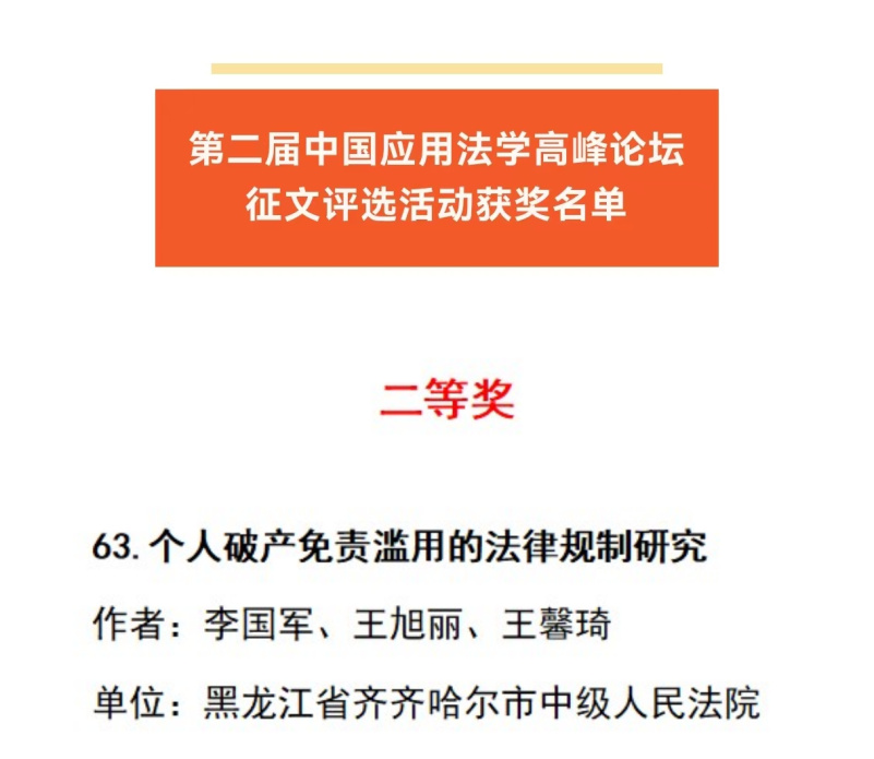 作为全国应用法学领域的重要学术交流平台,此次论坛得到司法界、法学界的广泛关注与积极参与,共收到来自各地法院、科研院校、法律实务部门等提交的论文 3561 篇。经过严格的初评、复评、终评三级评审机制,全国审判业务专家、齐齐哈尔市中级人民法院党组副书记、副院长李国军,民四庭庭长王旭丽,法官助理王馨琦共同撰写的论文《个人破产免责滥用的法律规制研究》凭借对个人破产制度实践痛点的精准把握、对法律规制路径的深入探索,脱颖而出,荣获二等奖。