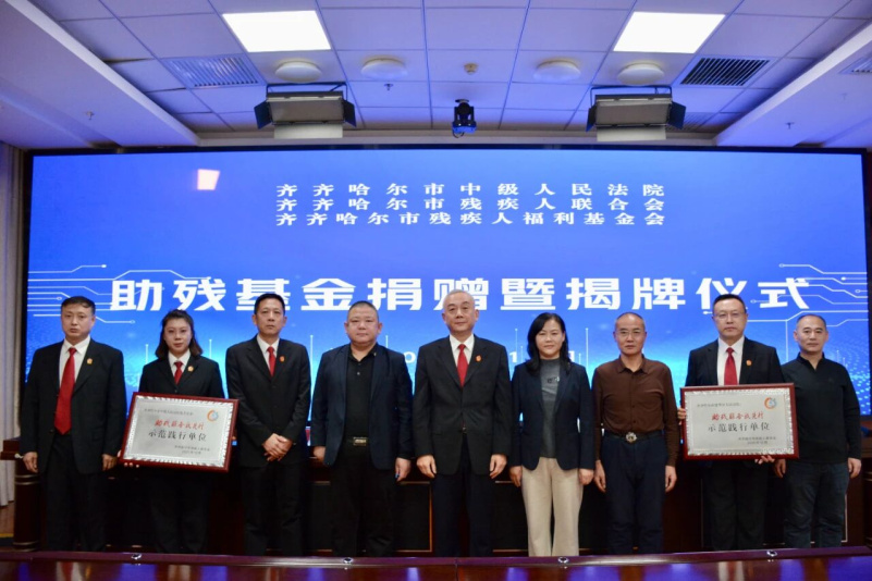12月3日国际残疾人日下午,齐齐哈尔市中级人民法院与齐齐哈尔市残疾人联合会、齐齐哈尔市残疾人福利基金会隆重举行助残基金捐赠暨揭牌仪式。市法院党组副书记、副院长李国军、市残联理事长何伟英、副理事长刘永明、建华区人民法院院长高峰、市残联组宣部长葛龙、市残疾人福利基金会理事长张振军出席活动,市法院审判委员会专职委员史殿喜主持活动。活动现场,市法院与市残疾人福利基金会签订《“汇善·齐齐哈尔中院”助残专项基金捐赠协议》,明确基金用途和使用范围等,随后,市法院工会主席祝维彪代表市法院捐赠专项基金。