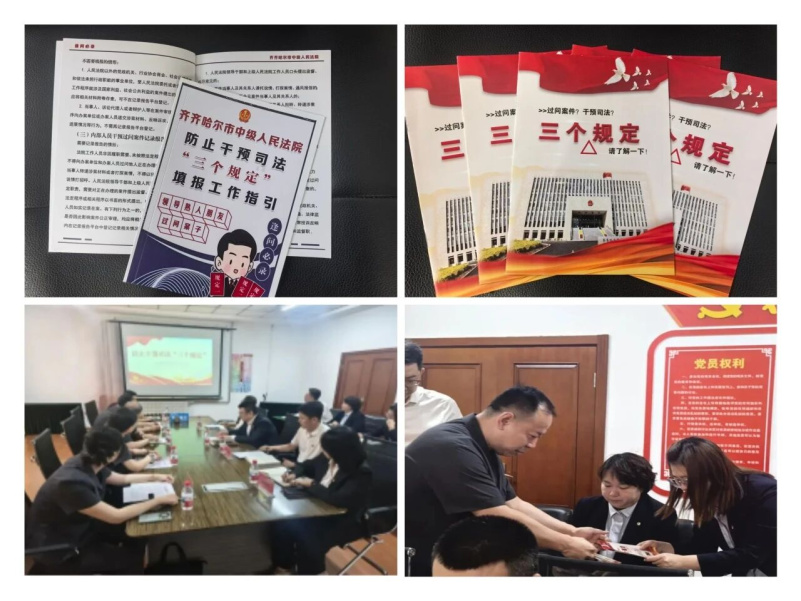 将“三个规定”作为重要纪律品牌抓紧抓实,通过领导宣讲、党组理论学习中心组、支部研讨等形式常态化开展学习;对新入职干警、督察条线开展专项培训,解读“三个规定”的精神内核与填报要求;通报违反“三个规定”典型案例,强化警示教育;制定《防止干预司法“三个规定”填报工作指引》,印制发放至全体干警,厘清政策界限;深入企业开展宣讲,向社会发放宣传手册……不断推动“三个规定”从制度约束转化为干警日常自觉,营造“不说情、不插手、不干预”的氛围。