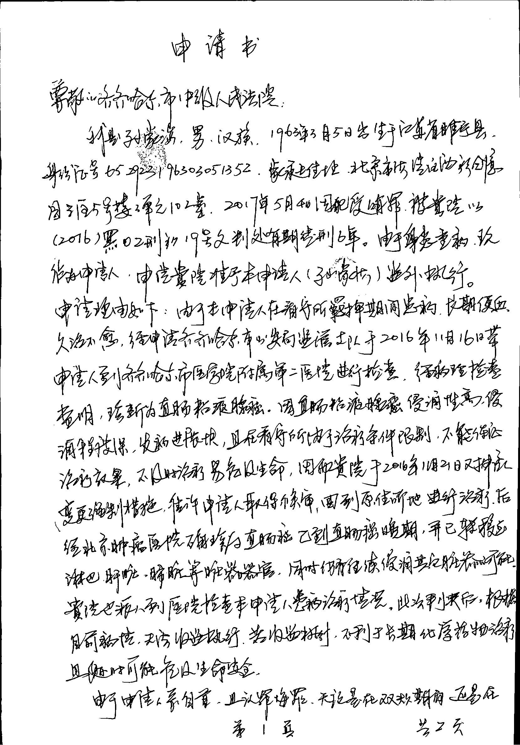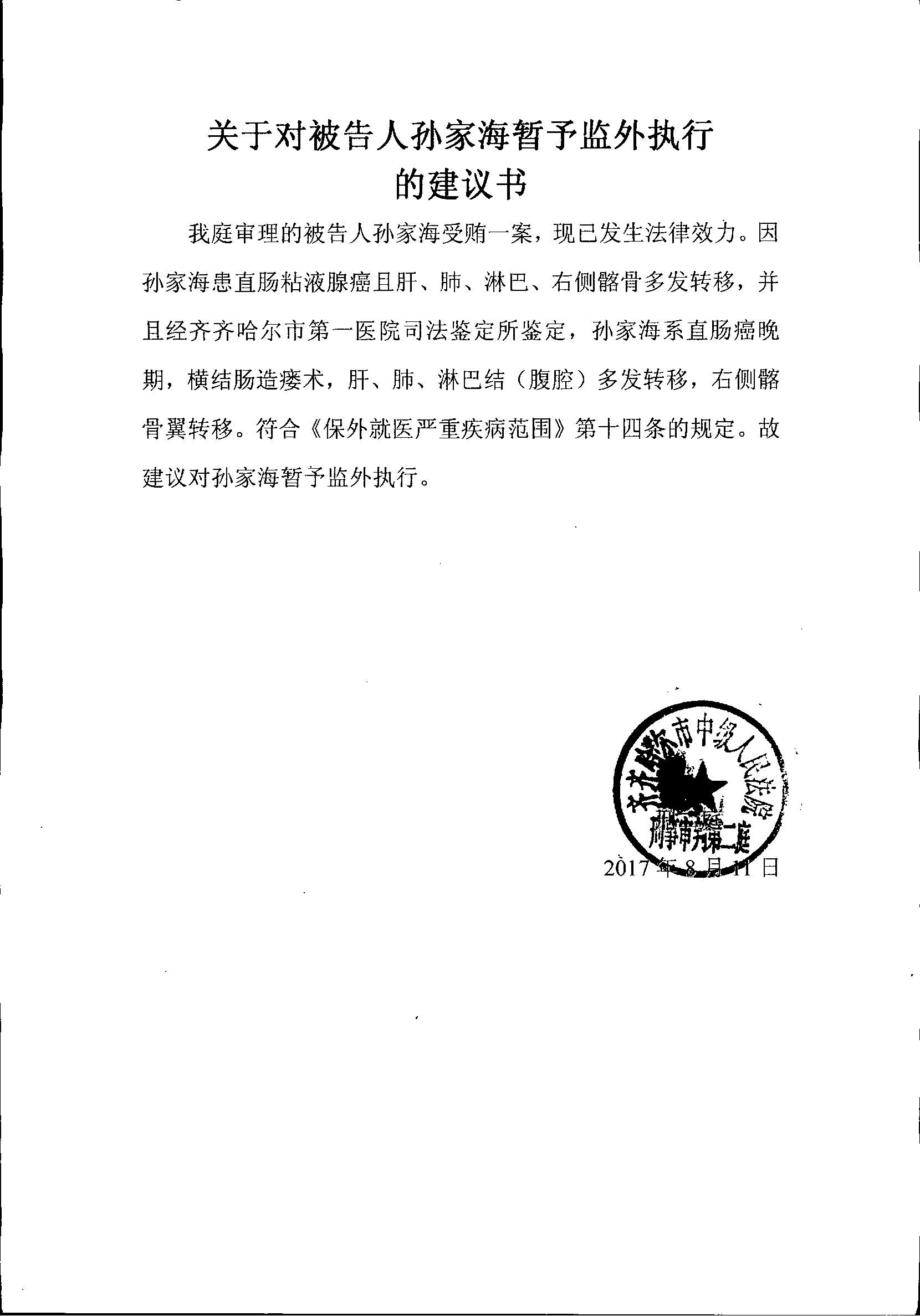 齐齐哈尔市中级人民法院关于罪犯孙家海暂予监外执行一案申请材料的公示 作者:审监一庭 发布时间:2017-09-06 15:05:19 罪犯孙家海,男,1963年3月5日出生,汉族,大学文化,原系中国水务投资有限公司副总经理,兼任新疆昌源水务集团有限公司董事长。因犯受贿罪,被本院判处有期徒刑六年,并处罚金人民币一百六十万元。现罪犯孙家海以其患癌症晚期为由,向本院提出暂予监外执行申请。依照黑龙江省高级人民法院的相关规定,现将罪犯孙家海申请书及齐齐哈尔市中级人民法院刑事审判第二庭建议书依法向社会公示,公示期限为五日(自2017年9月6日至2017年9月10日)。如对孙家海暂予监  外执行申请有异议,可以通过电话或信函等方式向齐齐哈尔市中级人民法院审监一庭反馈。