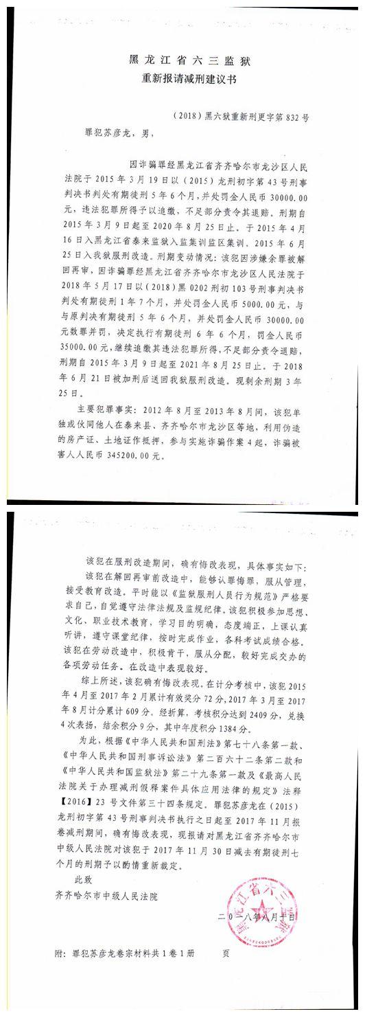 齐齐哈尔市中级人民法院关于六三监狱苏彦龙服刑人员减刑材料公示 发布时间:2018-08-16 14:05:46